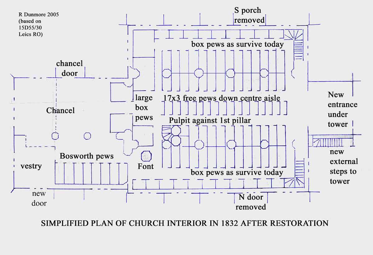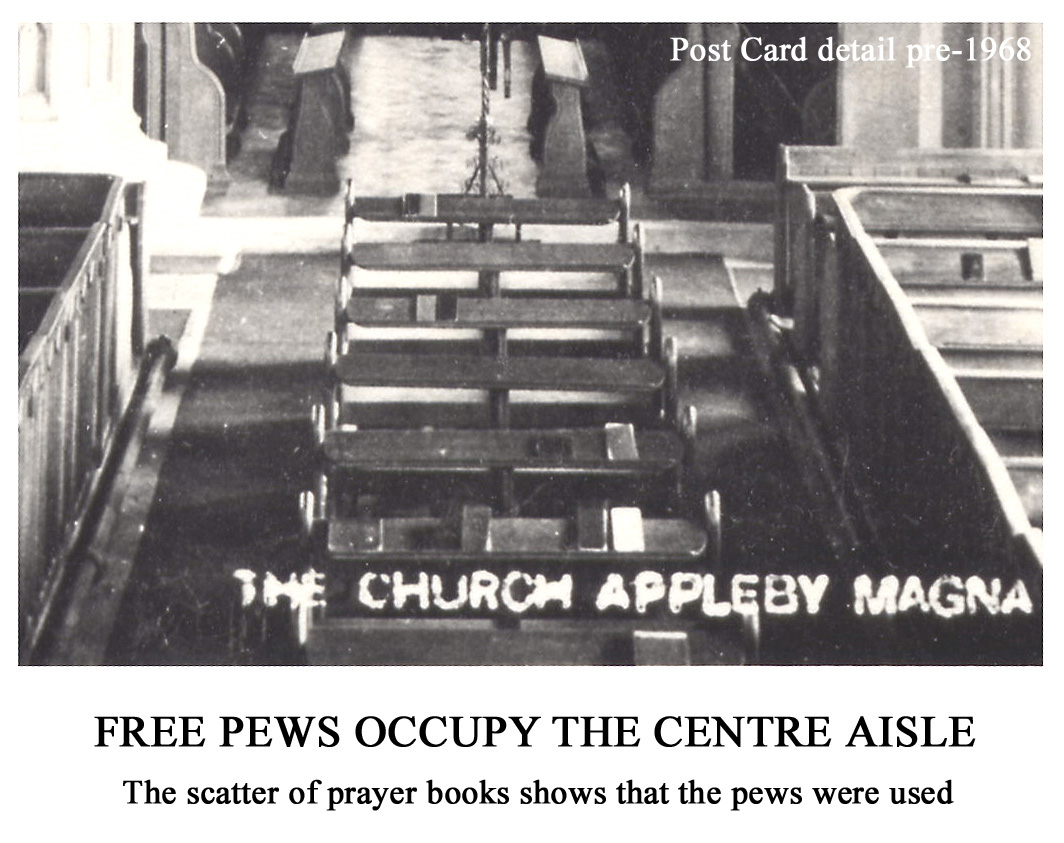 The chapel itself was the responsibility of the Governors of Bosworth Grammar School, as Lords of the Manor of Appleby Magna. They complied with the wishes of the restorers and paid for the refurbishment of the chapel including the provision of seating, for their tenants and employees, along the north wall. These pews no longer exist but the wooden flooring on which they stood may be seen at the rear of the choir vestry. Part is hidden under the back of the organ.