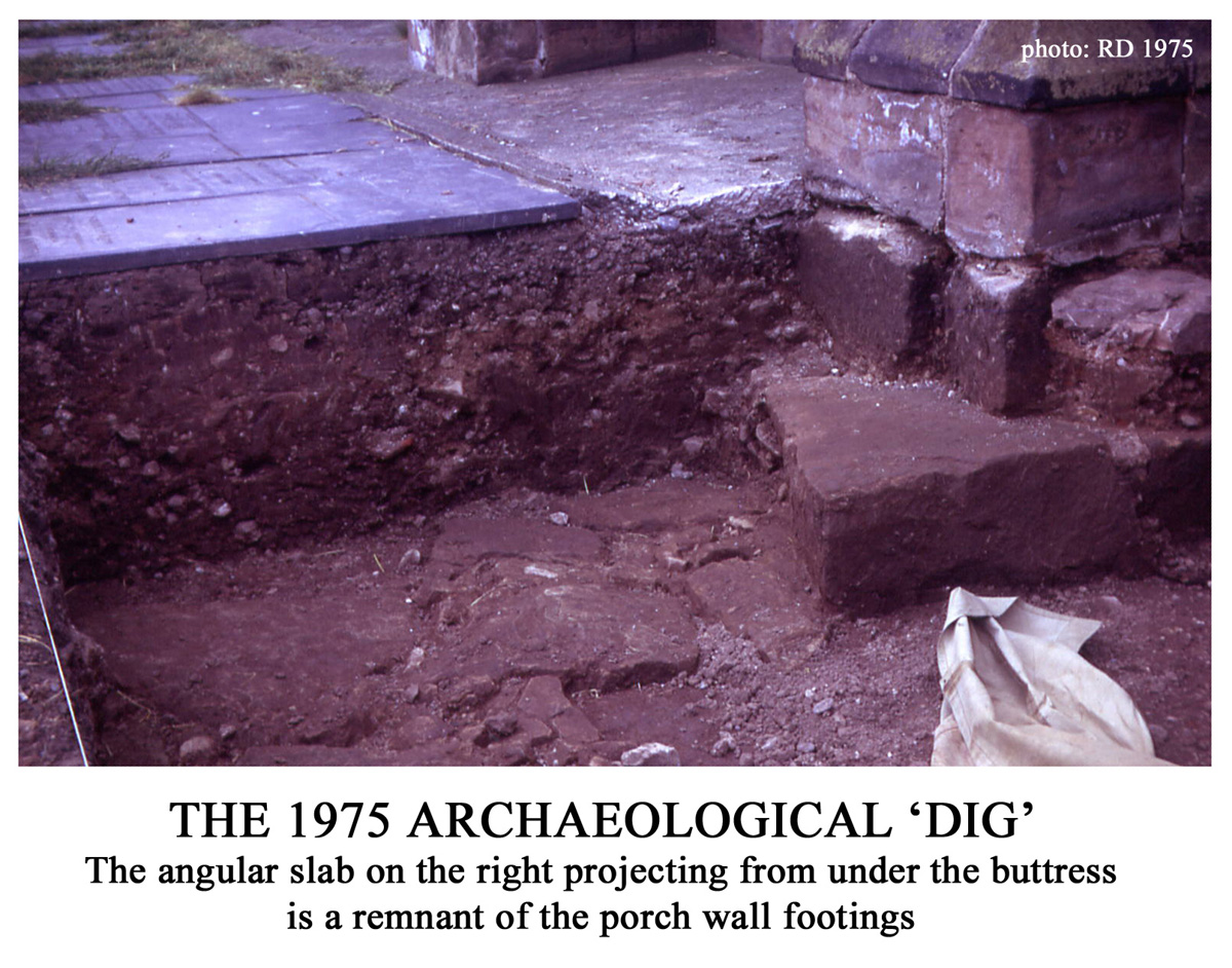 Apart from the documentary evidence of the church records and old drawings of the building reproduced by Nichols, there is archaeological evidence for the foundations of the porch obtained in 1975. At that time the Parochial Church Council embarked on a drainage scheme running along the outside of the south wall to try to alleviate dampness in the wall. As the ground was to be disturbed, Mr David Parsons the archaeological adviser to the Diocese was invited to investigate the area.