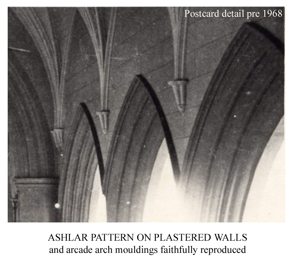 The internal walls themselves were replastered with simple rectangular score marks to imitate ashlar masonry and the piers were plastered faithfully reproducing the original architectural moulding. This became apparent when plaster was stripped from part of the north arcade in the 1950s. The reason for plastering the walls in the first place lay in the poor quality of the underlying stone and this would have been apparent early in the life of the building. John Nichols, writing before 1811, complained about the plastering obscuring every antique mark (17). Natural stone with a warm colour is most appropriate in a medieval building but, with the stone badly deteriorating, the use of plaster became essential.