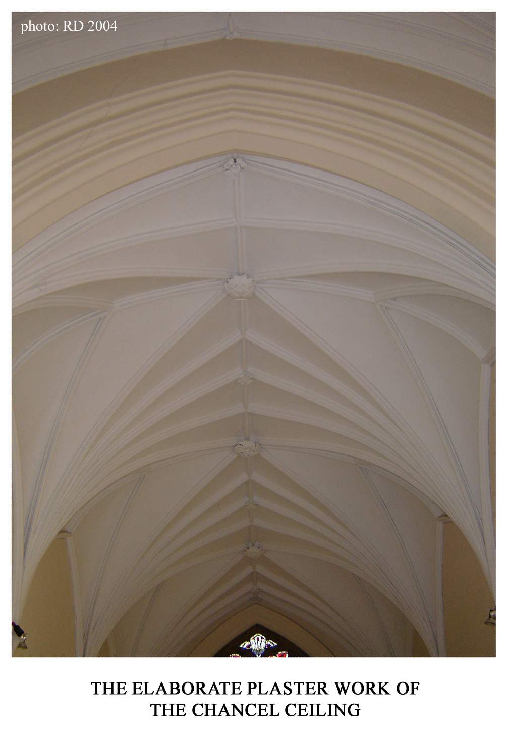 The elaborate design of the ceiling raises the question of how the work was carried out. The technique for such work was to create sections of the ceiling groins on a mould at ground level. These were then lifted into place and fixed on a barrel-shaped frame of timber and laths constructed below the roof. Not every contractor would have been able to tackle such a difficult project and the result is to the great credit of the builder William Matthews.