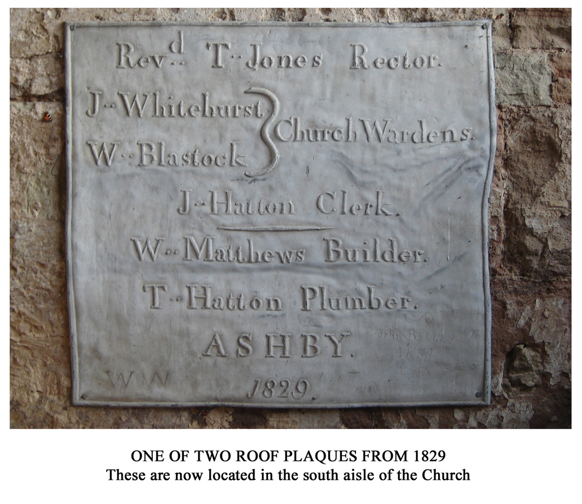 On two inner slopes of the old roof and visible only from the tower two identical lead plaques had been fixed with the names of the current rector and wardens and the clerk of the parish together with the names of William Matthews the builder and Thomas Hatton the plumber. Pigot's Directory of 1835 lists them both in Ashby de la Zouch (26). Although Matthews is described as carpenter and joiner, he was clearly more than that; he was an accomplished builder. Hatton was described as plumber and glazier.