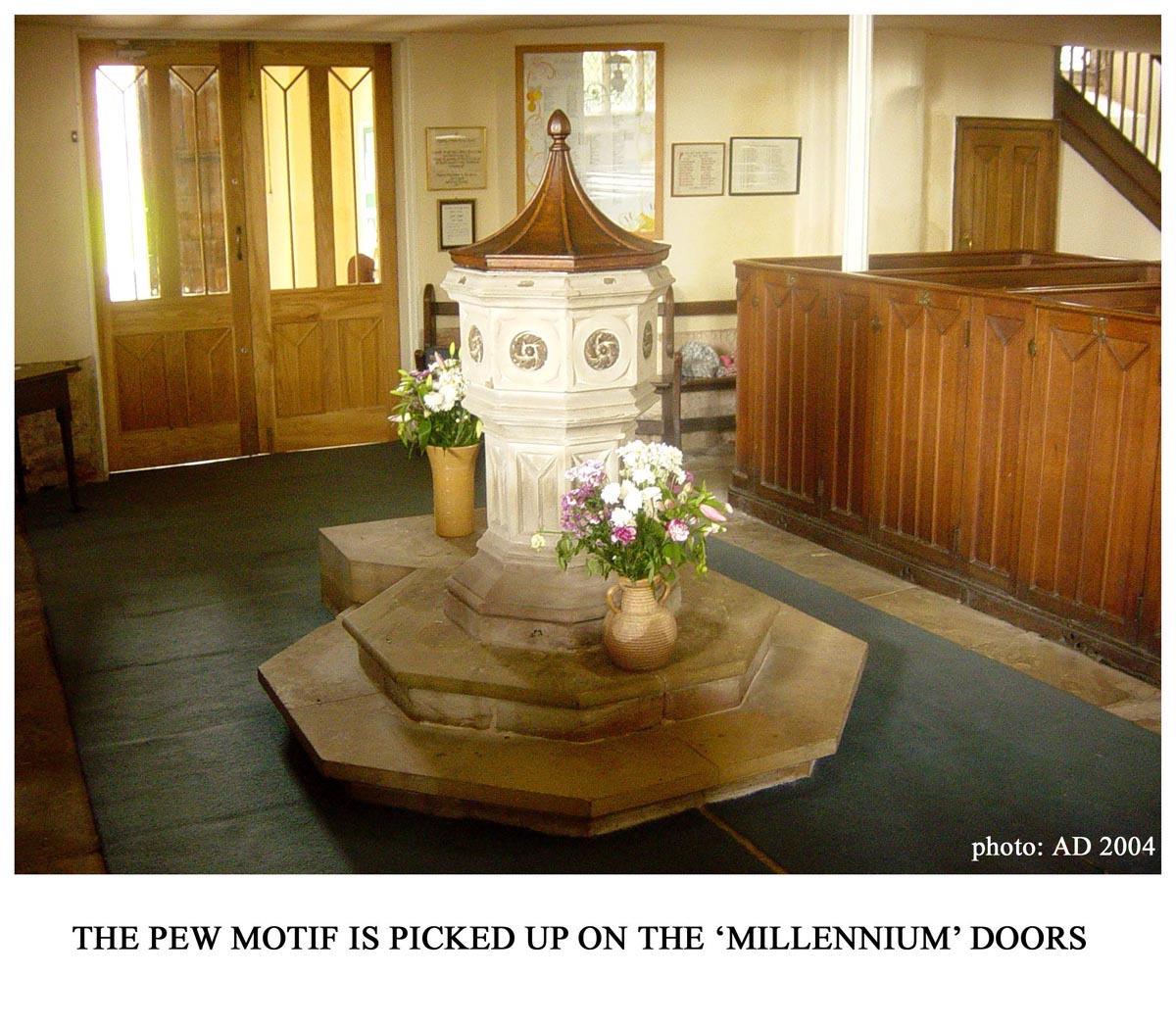 Also executed in oak, the front of the gallery copies the restrained motif of the pews below. It is fitting that this pattern has again been used on the 'Millennium Doors' inside the church entrance (see picture).