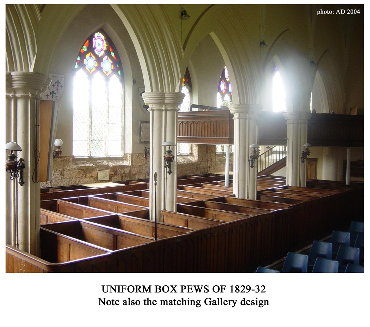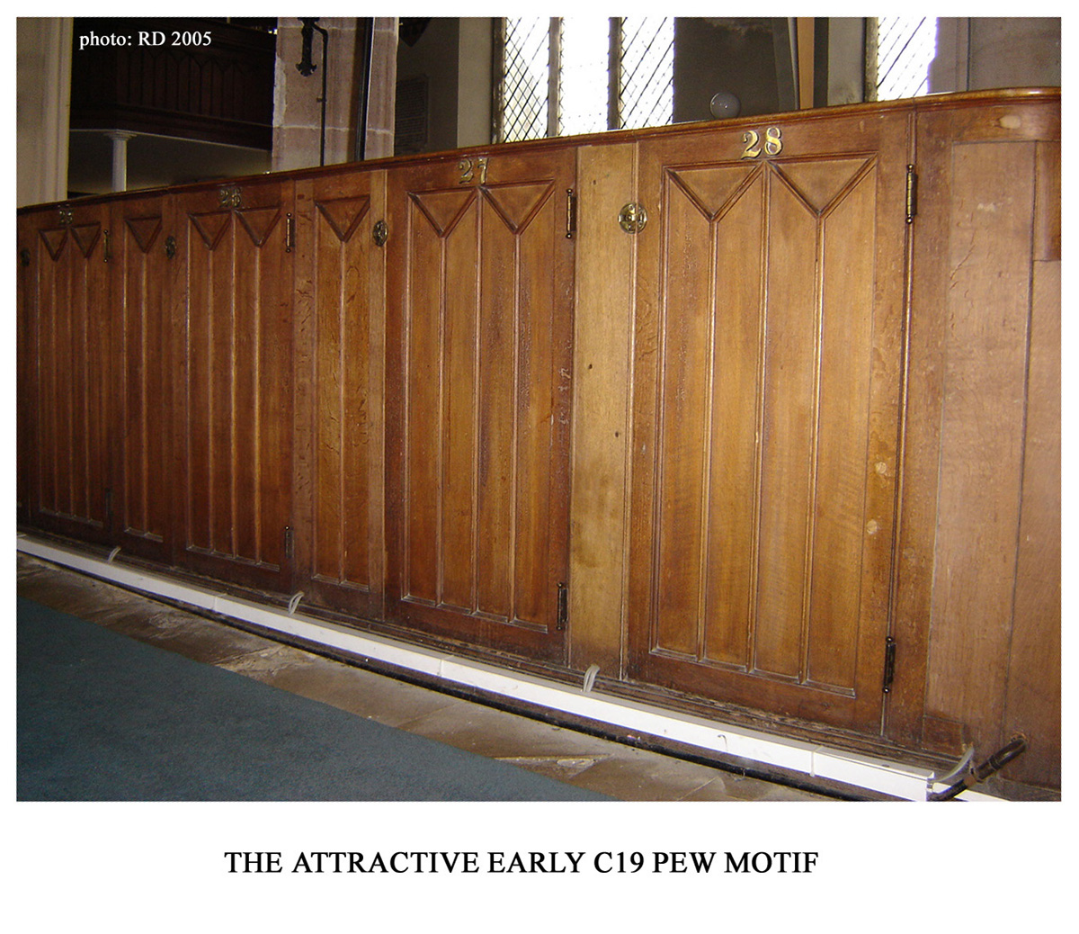 Most of the pews occupying the main body of the church surviving today date from this period. As can be seen from the plan, orderly narrow boxes stretched from the back (west) of the church only as far as the first piers of the arcades ie up to where the pulpit was located on the north side. Forward of that position, large pews backing on to the chancel area were provided for the gentry, the Moores and probably the rectory family, who had occupied boxed seats in these positions previously.