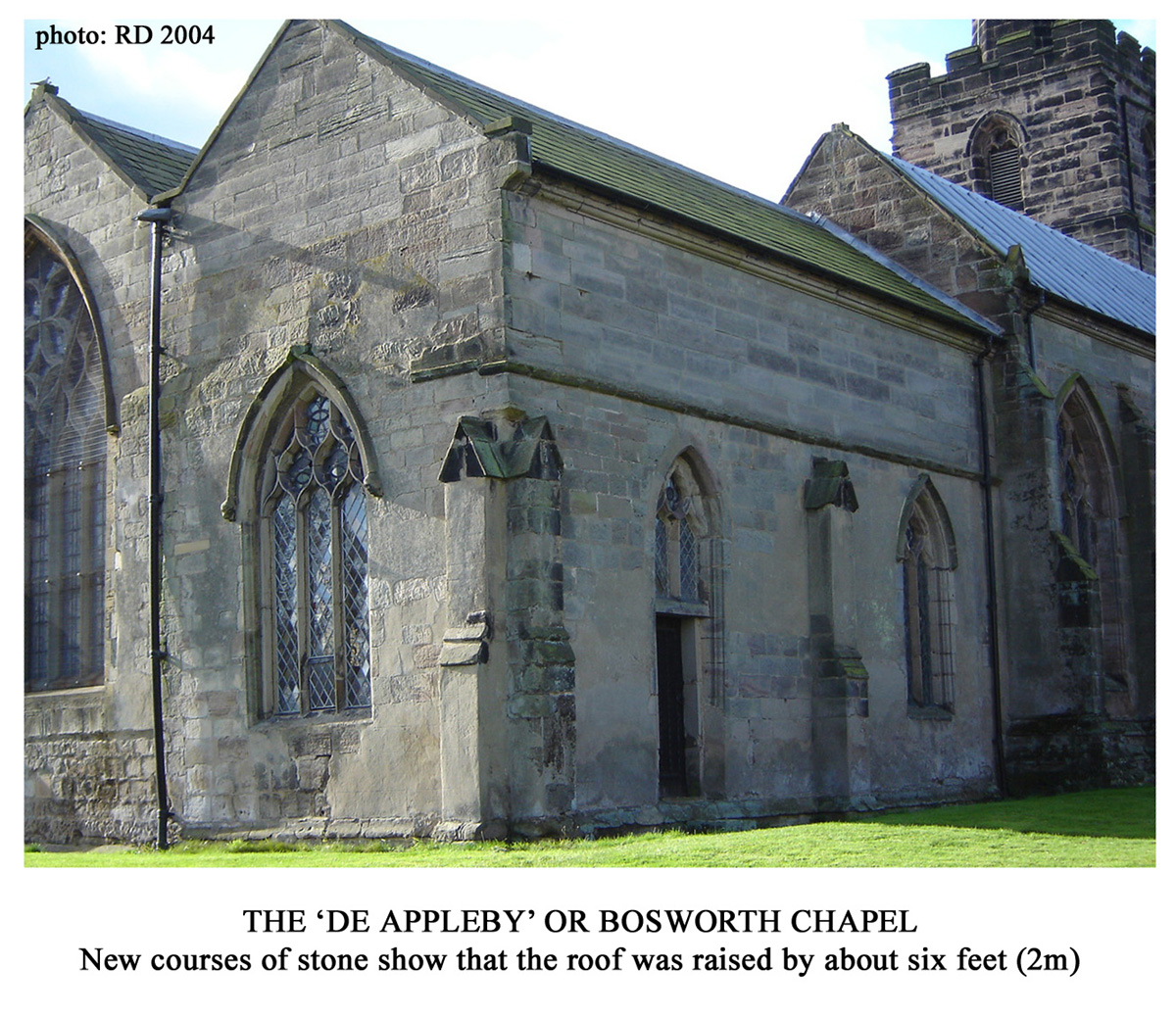 The de Appleby Chapel is the oldest part of the whole building and was the responsibility of the Lord of the Manor of Appleby Magna. In the early 19th century the governors of Bosworth Grammar School still held this position and their co-operation was obtained for the renovation work.