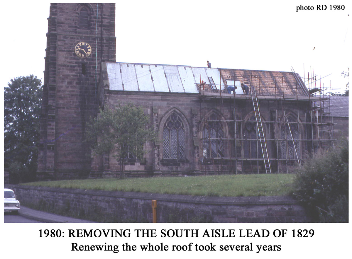 The weight of large sheets of lead results in stretching and slippage, especially when subjected to a wide range of temperatures. Consequently over the years repairs were necessary. By the late 1970s it was realised that complete re-roofing was required and this was undertaken from 1980 when Canon Christopher Cox was rector. To reduce the weight of the lead sheets, narrower sections were used.