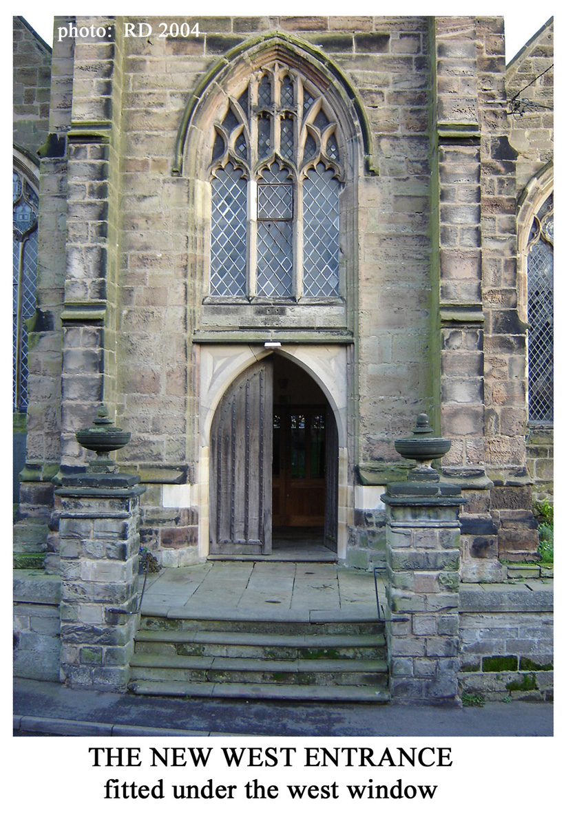 The closure of the north and south entrances was made possible by the provision of a west entrance (see picture) with a new porch formed in the area under the tower where formerly the vestry had been located. The new arrangement was part of the architect's plan and conformed to the current fashion of providing the main entrance at the west end of the church. Local churches newly built at that time, such as St John's Donisthorpe, Holy Trinity Ashby and Christ Church Coalville, all feature a western entrance (13).