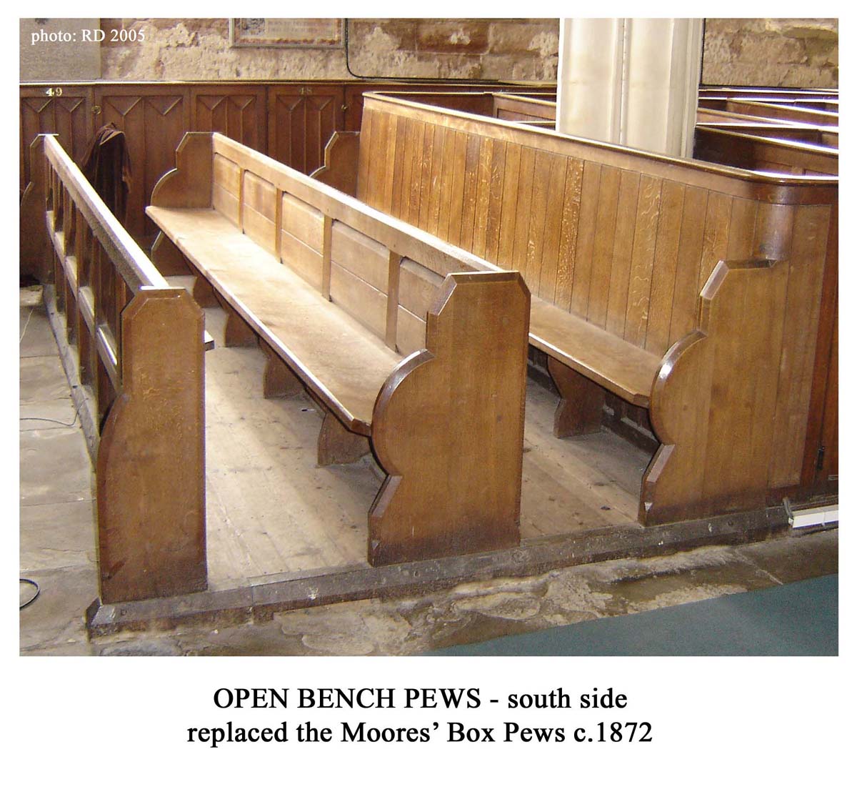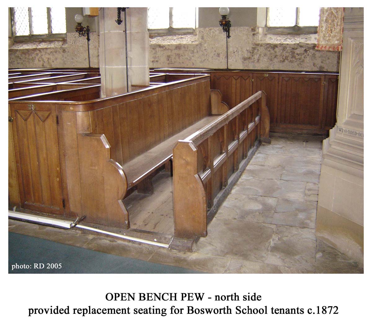 The establishment of the altar as the main focal point of the building and the construction of a pulpit against the chancel arch meant that the box pews occupied by the Moores were no longer suitable. In addition, the installation of an organ in the old chapel, together with its use as vestries, led to the complete removal of the Bosworth pews. Replacement seating took the form of new pews at the front of the church, two benches on the south side for the Moores and one on the north side for the Bosworth tenants. All of the ground level congregation were now facing the same way.