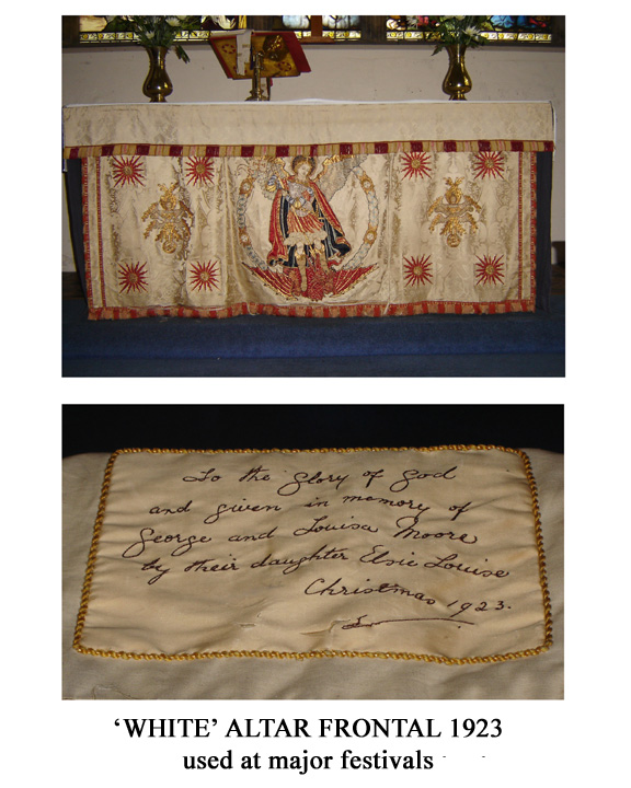 The other two pictures shown here are from a postcard photograph taken probably in the mid-1930s when the late Victorian fittings were still intact. The altar is dressed in liturgical colours (probably the red frontal for Whitsun and visible in the close-up detail) and behind the altar under the east window is a screen, or reredos, with a patterned design typical of the period. This screen appears to be matched by curtains rising to a higher level in the corners on either side. The reredos and curtains were removed in the mid-20th century when the rich High Church style was rejected in favour of plainer appearance.