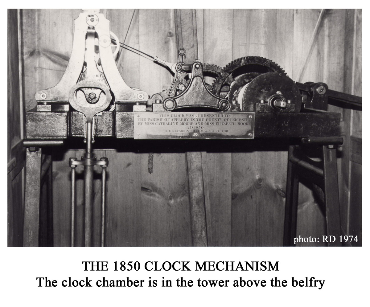 The inscription plate reads: THIS CLOCK WAS PRESENTED TO THE PARISH OF APPLEBY IN THE COUNTY OF LEICESTER BY MISS CATHERINE MOORE AND MISS ELIZABETH MOORE 1850. THE REVD. JOHN M ECHALAZ MA RECTOR, THOMAS FOSTER JOHN ALLDRITT CHURCHWARDENS.
