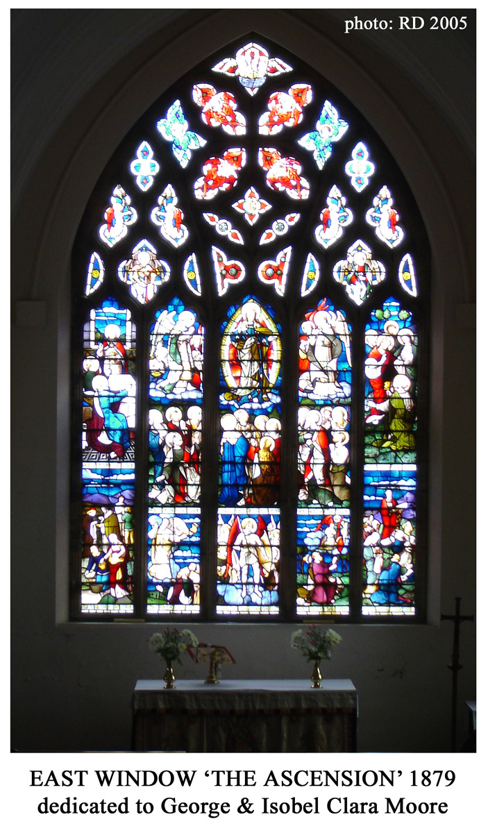 Squire George Moore died aged 59 on 26th August 1871 as the chancel work was starting. His wife Isobel Clara had died earlier, aged 56, on January 17 1867 (23). Following the completion of the chancel remodelling, there was a delay of eight years before a new east window was completed in their memory. A design by James St Aubyn was not implemented at the time of the 1870-72 chancel work because of cost (24).