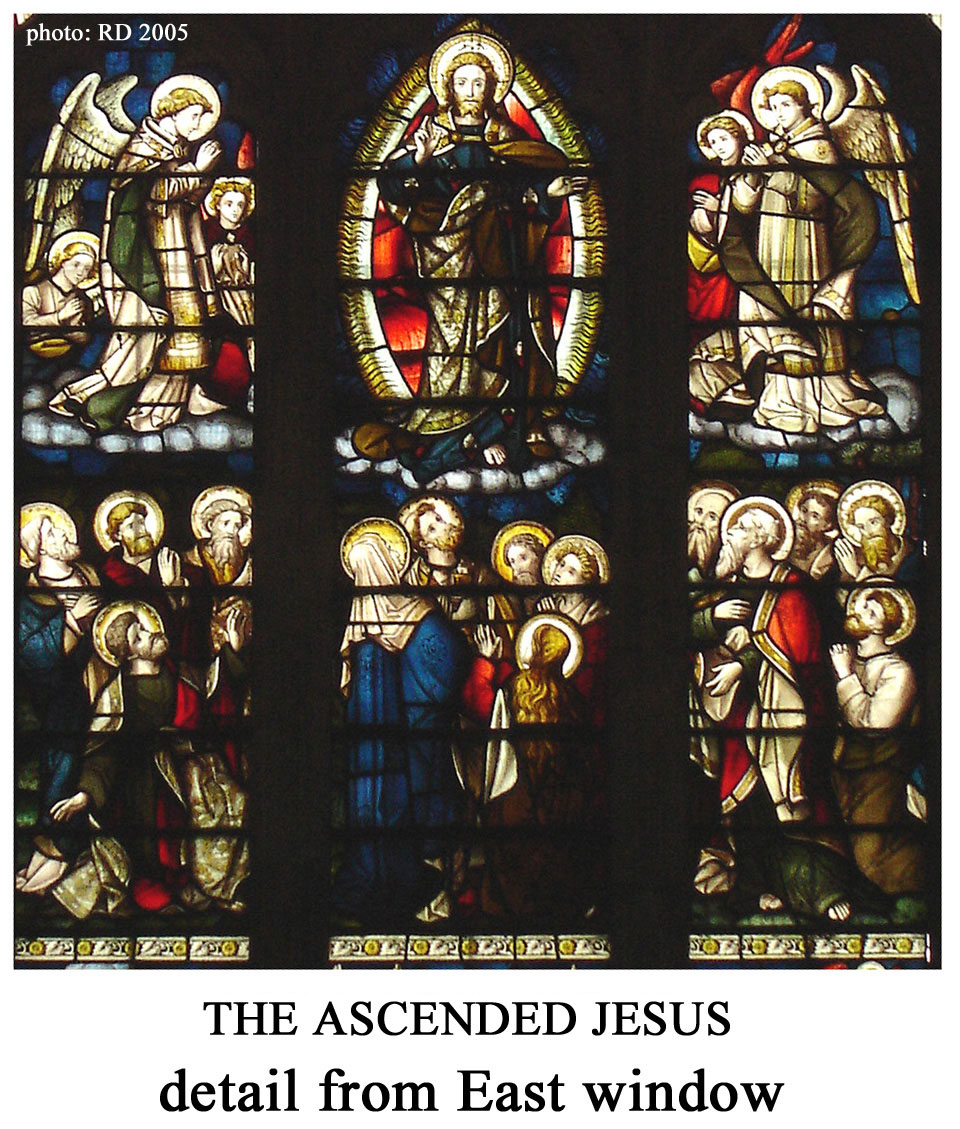 The subject of the east window is that of the The Ascension of Jesus into Heaven. The dramatic events which led up to the Ascension are described by St Luke in the last chapter of his Gospel and the first chapter of the Acts of the Apostles (also written by Luke). Jesus last appeared to 'the eleven and those who were with them' at Jerusalem (Luke 24:33, RSV) and subsequently he took them to the village of Bethany, which is about two miles east of Jerusalem on the far side of the Olivet ridge or 'Mount of Olives' (vv.50-51). At Jerusalem he had 'opened their minds to understand the scriptures' concerning his death and resurrection; at Bethany he reassured them with the promise of the Holy Spirit and was then taken from them: '...as they were looking on, he was lifted up and a cloud took him out of their sight. And while they were gazing into heaven as he went, behold, two men stood by them in white robes, and said, "Men of Galilee, why do you stand looking into heaven? This Jesus, who was taken up from you into heaven, will come in the same way as you saw him go ...' (Acts 1:9-11).