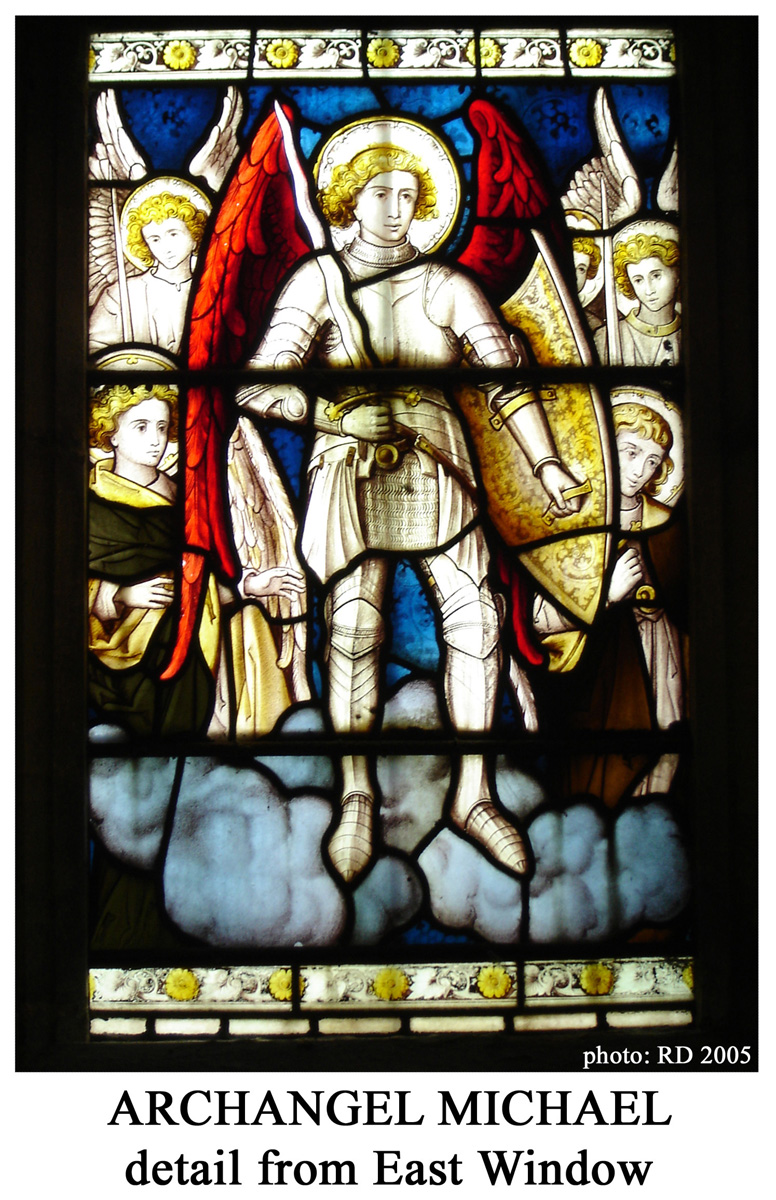 In the centre at the base of the window is the winged figure of the Archangel Michael, with sword and shield, accompanied by other armed angels of the Heavenly Host.