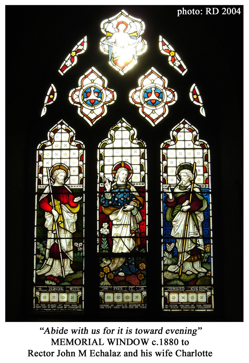 The other chancel window, overlooking the sanctuary, is in memory of Rector Echalaz and his wife: To the Glory of God and in memory of John M Echalaz M.A. 46 years rector of this parish died May 6th 1877 also of Charlotte his wife died October 20th 1880 by their surviving children. The burial register shows that the rector lived 76 years and his wife 75 years. The window, again in three sections, shows Jesus between two disciples. The inscription 'Abide with us for it is toward evening' are the words of the two disciples whom Jesus met on the road to Emmaus after the Resurrection (Luke 24: 29). They are the words which inspired the hymn 'Abide with me'.