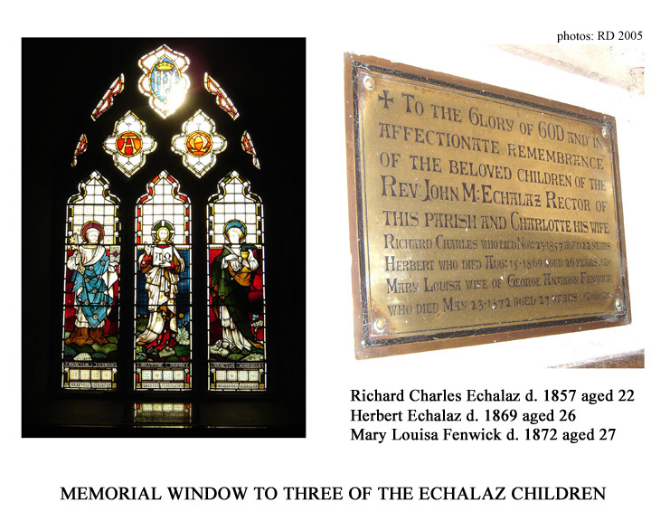 That then was the state of the church and chancel which Rector Echalaz saw in his lifetime. He died in 1877 and his wife in 1880 as we have seen from their memorial window (above). But further embellishments to the building have continued from time to time.