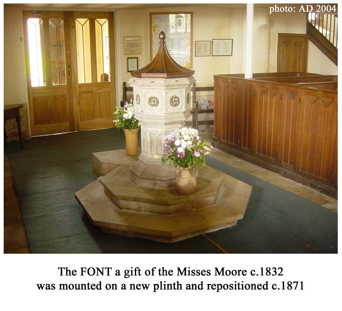 A further consequence was that the Misses Moore's font, which had been placed at the east end of the north aisle in the 1829-32 renovation, now required more space and prominence, so it was moved to the a central position at the west end of the nave in front of the main entrance, where it remains. Joseph Lilley built the new stone base, with steps, on which it was mounted (14).