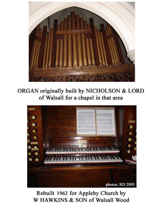 Space had been left in a recess at the back of the School's gallery for an organ and in 1838 as a gift from the Misses Moore of the White House 'a handsome organ was put up', probably the first one to be installed in the church (3). There is space for only a small instrument in this location but the church's services must have benefited immediately. Just over 30 years later, a larger replacement was installed in the de Appleby chapel (see below).