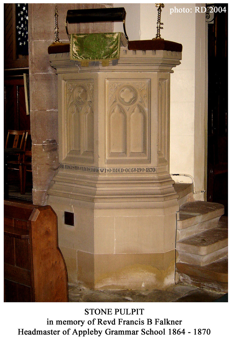 19. White's Directory of Leics and Rutland 1877: A beautiful stone pulpit has been placed in the church, as a memorial to Rev F B Falkner the late headmaster of Appleby school who died in 1870.
