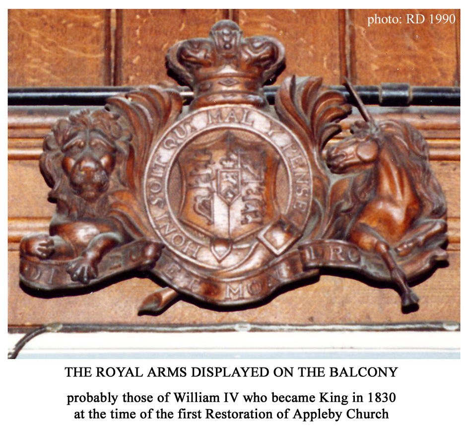 1. I am grateful to Mr K R Wadd of Knighton who took the trouble to send me diagrams of royal heraldry from this period in September 1979. The Appleby arms, carved in wood, inevitably lack fine detail. What is clear is that they are late Hanoverian, so William IV seems the obvious identity.