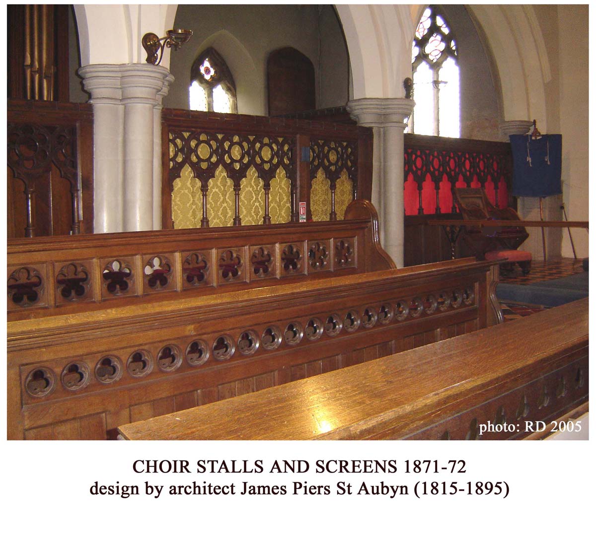 The main furniture for the chancel consists of seating for the choir and clergy and the whole area was separated from the vestries (the old chapel) by an elaborate screen.. These were all made of oak to the design of the architect James St Aubyn. A recent view of the choir stalls and screen is shown in the photograph.