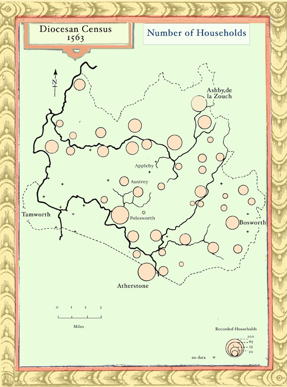 The period from mid sixteenth century onwards is known as the ‘early modern’ age because there are signs of a ‘modern’ economy and the breakdown of the old ‘feudal’ order. Between 1500-1700 there was a dramatic population increase in the survey region. Church census and subsidy returns for 28 of the 30 parishes show a 75 per cent increase in the numbers of listed households between 1563 and 1670, which is markedly above the Leicestershire average of 67 per cent over the same period. These increases were particularly noticeable in the market towns described in Richard Blome’s great seventeenth-century survey of the kingdom.