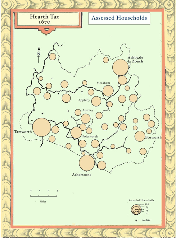 The fastest growing towns, Ashby, Atherstone and Tamworth were at the intersection of trade routes. More isolated towns did not grow as fast. Comparison between the 1563 census and the 1670 hearth tax listings clearly show this drift of population to the better situated market towns astride the main trade routes, and a corresponding decline of the smaller trading centres. But the population figures do not tell the whole story. Some markets declined despite increased population. In 1563 Nuneaton, with 188 households, was the most populous town in the Anker valley. No town in the survey area even approached it in size. By 1670 however, this lead had been lost and Ashby, Tamworth and Atherstone, competed to challenge Nuneaton’s position as a connection point for the lucrative London trade.