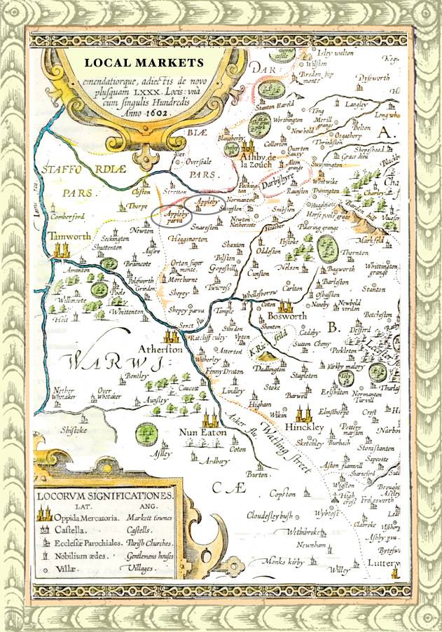 Reference to bequest of barley and peas ‘by the measure now used at Burton-upon-Trent’: L.R.O. wills, Richard Wright of Appleby, 1588/64; An archdeaconry court case involving William Pecher of Appleby refers to Swepstone farmers’ cattle outside an alehouse in Atherstone market square; Maps showing the relative position and importance of local market towns in Dugdale's Warwickshire (1st ed., 1656), 636-7; R. Plot’s Natural History of Staffordshire (Oxford, 1686), frontis. In 1698 Celia Fiennes went from Tamworth to Lichfield in an hour on ‘a fine, new gravel road’. C. Morris, Celia Fiennes, 164. Had she attempted to travel from Appleby to Tamworth on Saturday she may have taken longer as the way would have been crowded with people taking produce to Tamworth from surrounding villages.