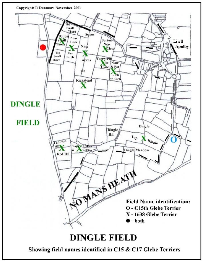 Dingle Field is first recorded in the 1606 Glebe Terrier. It lay across the county boundary line which approached the village from No Mans Heath and, of the furlong names, many are derived from local topographical features. The prime example is the eponymous Dingle, a wooded hollow which lies a short distance north of the modern Dingle Farm. A stream rising in this area flows down the dingle hollow, across the Tamworth Road and, passing west of Chilcote, joins the Mease nearby (20). Many names (Small Thorn, Nine Acres, Tamworth Pit, Red Hill, etc) derive from Old English but give little impression of antiquity. It may be concluded from this that most of Dingle Field is a relatively late development.