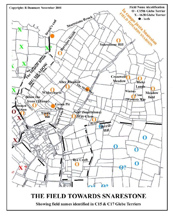 The Field Towards Snarestone and The Field Nigh Norton may likewise represent the respective Leicestershire Domesday holdings of the Countess Godiva and Henry de Ferrers. Dingle Field which straddled the county boundary line and is not mentioned in the 15th Century Glebe Terrier, seems to be a later encroachment on the heathland towards No Mans Heath.