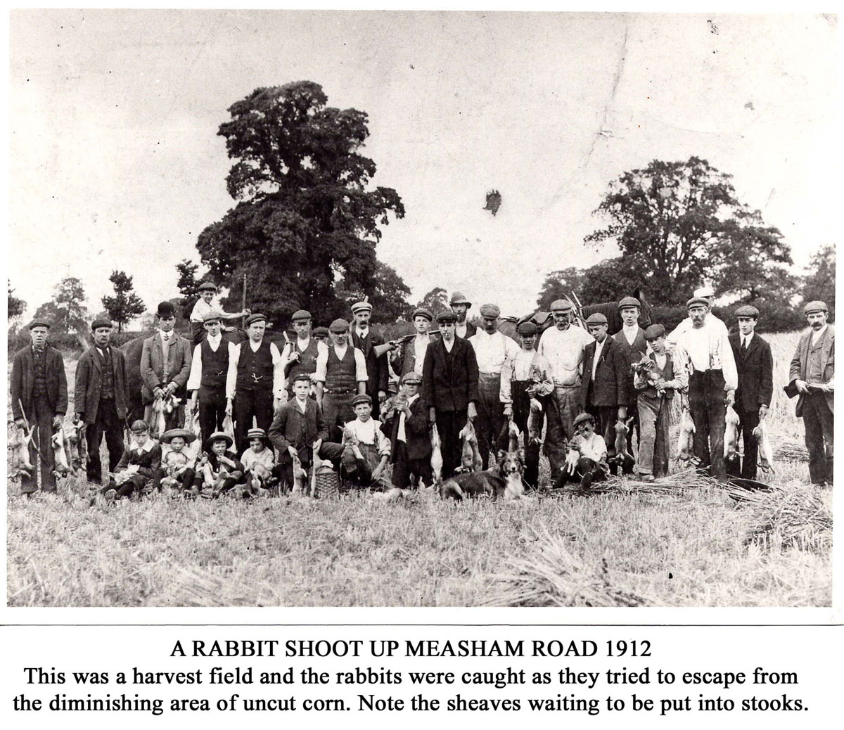 The 1912 photograph of the Rabbit Shoot up Measham Road below shows men and boys in an Appleby harvest field. Two men with guns may be seen. The 'bag' was said to be 80 rabbits. Behind the group can be seen two horses, one with a boy on its back, and in the foreground lie hand-bound sheaves awaiting stooking.