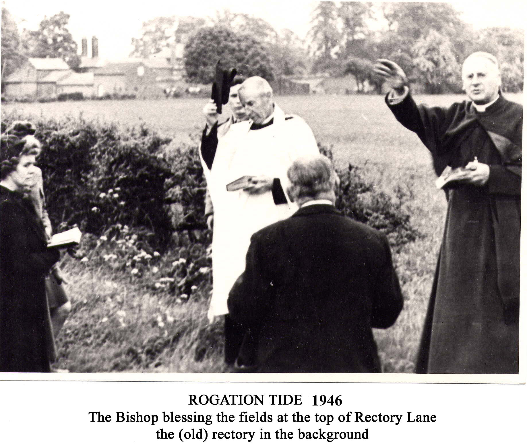 Another annual procession which involved the church was the blessing of the crops at Rogation-tide. It is not clear whether this was a continuous tradition or whether there was a revival when it took place after the Second World War. The accompanying photographs show scenes from the procession now known to have taken place in 1946*. On this occasion the visiting Bishop of Leicester gave the blessings. The procession started from the church and made its way to the top of Rectory Lane and called at the (old) Rectory to bless the rectory fields. The allotments would have been another stop for the newly sown crops to be blessed.