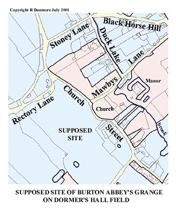 Where could the Appleby grange have been? Evidently it would have been on the Abbey's land which lay north-west of the village. The most obvious site would be that occupied by Dormer’s Hall in the 17th and 18th century. This lay a short distance west of the church and mirrored the Leicestershire manor building (Moat House site) to the east. The existence of Dormer’s Hall itself is obscure and this is the subject of a later article, but pottery fragments from the 12th and 13th century, which I found on the site, strongly suggest occupation in the medieval period, at the time of ownership by Burton Abbey (12).